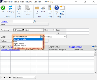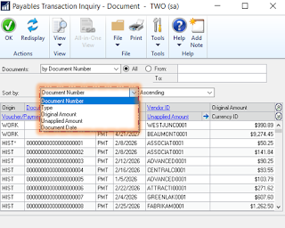 On the payable module, there are other two inquiry windows which have got new sorting options as illustrated below: