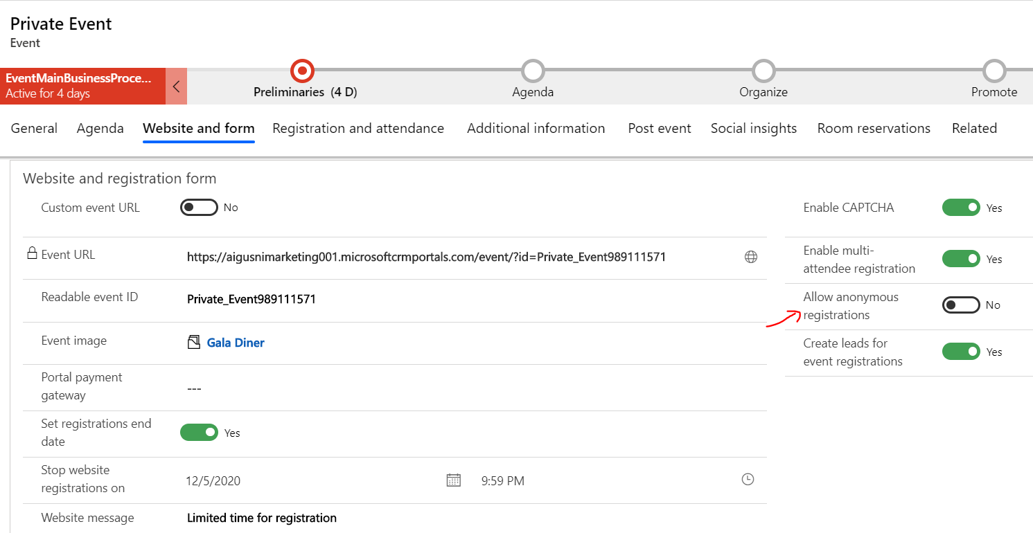 Dynamics 365 Marketing Portal: Understand "Allow Anonymous Registration" field in real LIVE of Event Management Portal