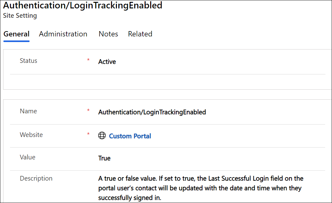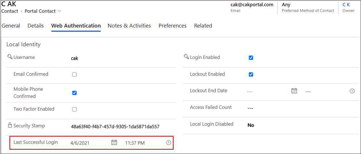 Once this setting is added, and the user has logged in to the portal, the Last Successful Login field in the contact entity will be filled.