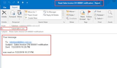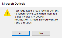 When an email with the attached invoice is received, and the recipient tries to open it and read it, an Outlook’s message pops up to ask should a read receipt be sent. If the recipient clicks Yes, an automatic email will be sent to Read receipt address – in my case Tabshir@live.com that I have set up above in the Docentric report setup > Email sending settings form.