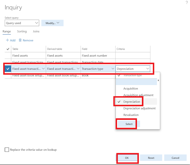 Set criteria like transaction from date to date and transaction type Depreciation, then click OK