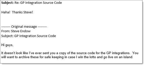 And then there's the case where customers switch GP partners, and 2 years after the switch they realize that they don't have the source code for a GP customization or integration. This happens all the time.