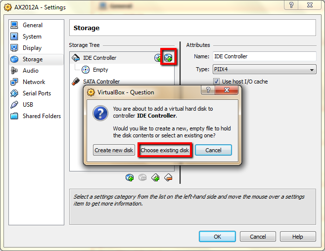 Add hard disks by clicking the disk icon – then “Choose existing disk”