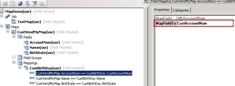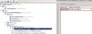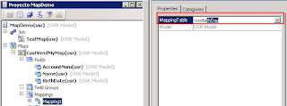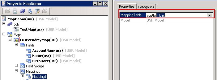 b.Click derecho en el nuevo mapeo, click en Propiedades, luego establecer la tabla en la propiedad MappingTable. Seleccionar como valor de esta propiedad la tabla CustBirthDay