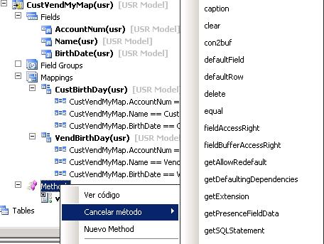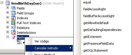 Methods. Despliega todos los métodos disponibles para el mapa. En este nodo puede añadir nuevos métodos o sobrescribir métodos de la clase kernel xRecord y añadir su propio código.