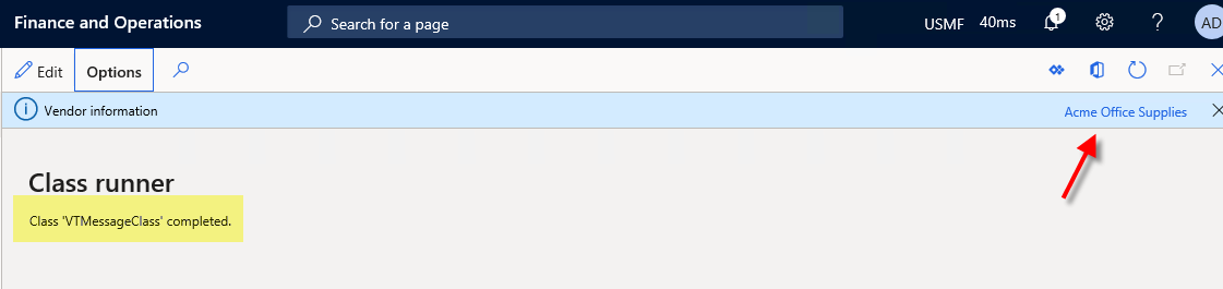 public static void main(Args _args) { VendTable vendTable = VendTable::find('1001'); MenuItemMessageAction actionData = new MenuItemMessageAction(); actionData.MenuItemName(menuItemDisplayStr(VendTable)); actionData.TableName(tableStr(VendTable)); actionData.RecId(vendTable.RecId); str jsonData = FormJsonSerializer::serializeClass(actionData); int64 messageId = Message::AddAction(MessageSeverity::Informational, "Vendor information", vendTable.name(), MessageActionType::DisplayMenuItem, jsonData); } |