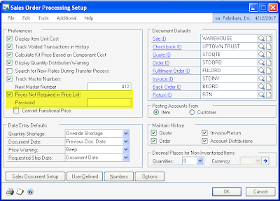 When this option is marked and a price isn‘t found for the item, the price in the Sales Order/Invoice will be zero and you can enter a price. Also, you can enter a password for this option if you want to limit the users who can enter item prices. If this option is not marked, you can’t enter items that aren't setup on a Price List or Price Sheet.