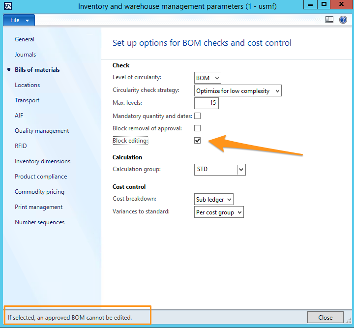 | If "Block editing" is selected, then an approved BOM cannot be edited. |