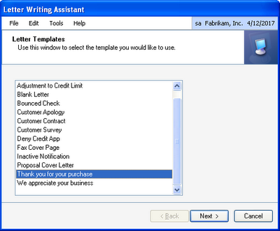 If you need to send a form letter to your customers, vendors, employees, etc., SmartList provides the Letter Writing Assistant to help automate the process. Let's say you want to send a thank you letter to your customers. Open SmartList and choose the Customers SmartList. Then, click the Word icon. The following window opens.