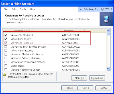 Choose the letter template you'd like to use then click 'Next'. The Customer selection window opens. In this window, you can Mark All or Unmark All to make your record selection easier.