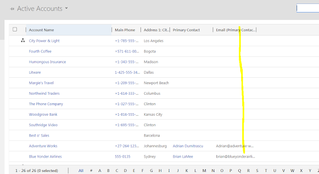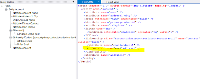 Issue: - If we go to the view of “Active Account” and try to configure sorting we will see only column of Account entity. Even we have added email address of primary contact in our view.