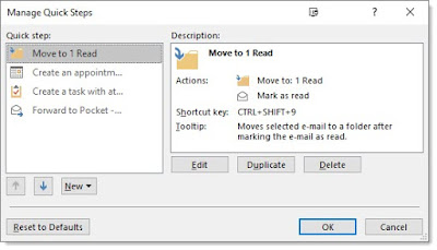 1. Archive: CTRL+SHIFT+9. This moves the selected or open email to my single archive folder. I do not categorize messages into different folders, as the Search feature is finally good enough that I Search instead of looking through different folders. I have been using this Quick Step for years, so it was already done. I chose the number 9 because I typically press CTRL+SHIFT with my left hand, making 9 easy to press with my right hand.