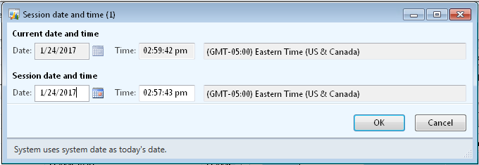 The Session date and time will revert back to the current date and time when you close your AX session or set it back to today's date. When using this function, it is imperative that you keep in mind that changing the session date is affecting the posting date, the source document date, and any period statistics data collected during the time in which you have updated your session date.
