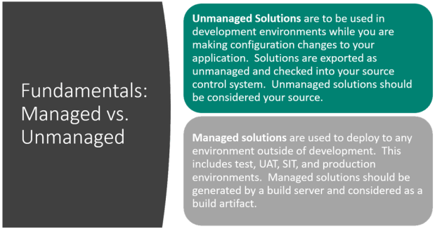 Managed solutions were often perceived to cause problems. Unintended dependency issues sometimes made them challenging to remove, and the order of import could influence the application behaviour presented to the user if not reliably managed. In the current Dynamics landscape, managed solutions have matured and are the recommended approach for any downstream systems.