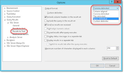 5. Next is a feature that you may not need to use regularly, but may come in handy for situations where you'd like to save the query results directly to a text file rather than paste them into Excel. Under Options -> Query Results -> SQLServer -> Results to Text, check out the Output format options. SSMS can format the text query results to be comma or tab delimited. But a word of caution: the Comma delimited format does not produce a CSV compliant file--it will not put apostrophes around text field values that contain a comma. So be aware of your data before using that option.