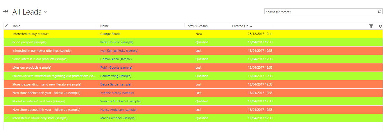 In this article, we will show grid rows of Qualified Leads in Green Color, Lost or Disqualified Leads in Red color and Newly created Leads in Yellow Color