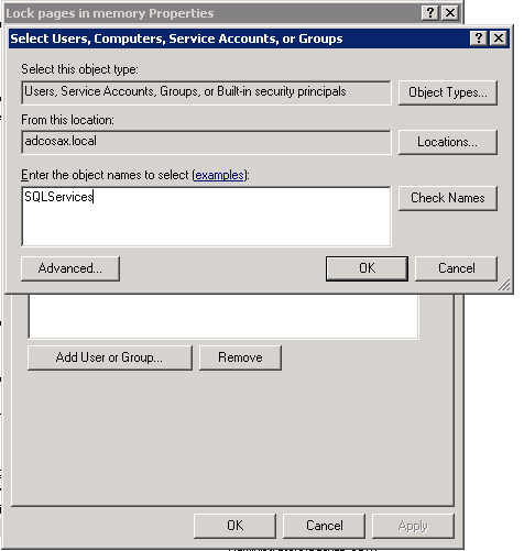 Expanda as opções Conputer Configuration > Windows Settings > Security Settings > Local Policy e clique em User Rights Assignement. Do lado direito da tela de um duplo clique em "Lock Pages in Memory" e adicione a conta de serviço do SQL Server. Repita o processo para a opção "Perform Volume Maintenance Tasks".