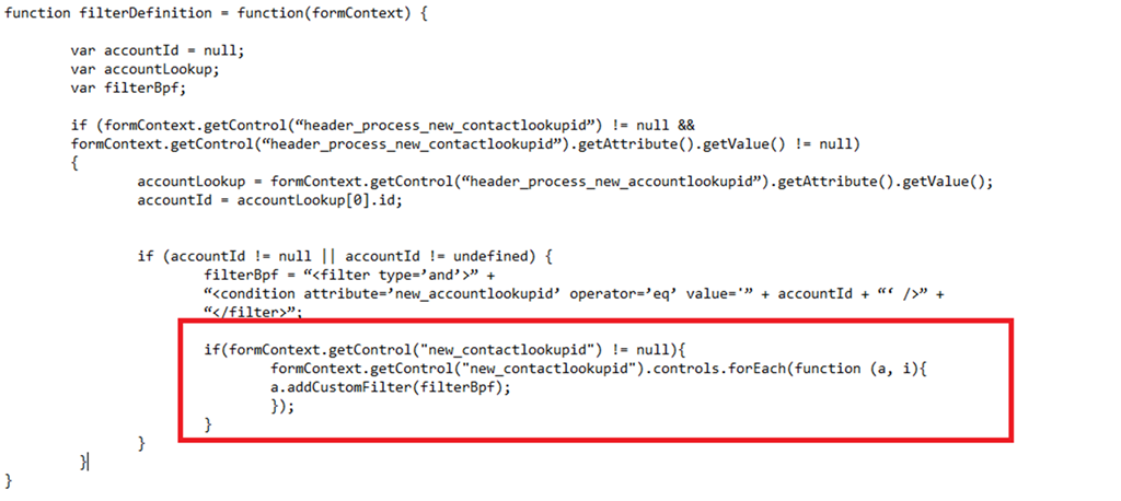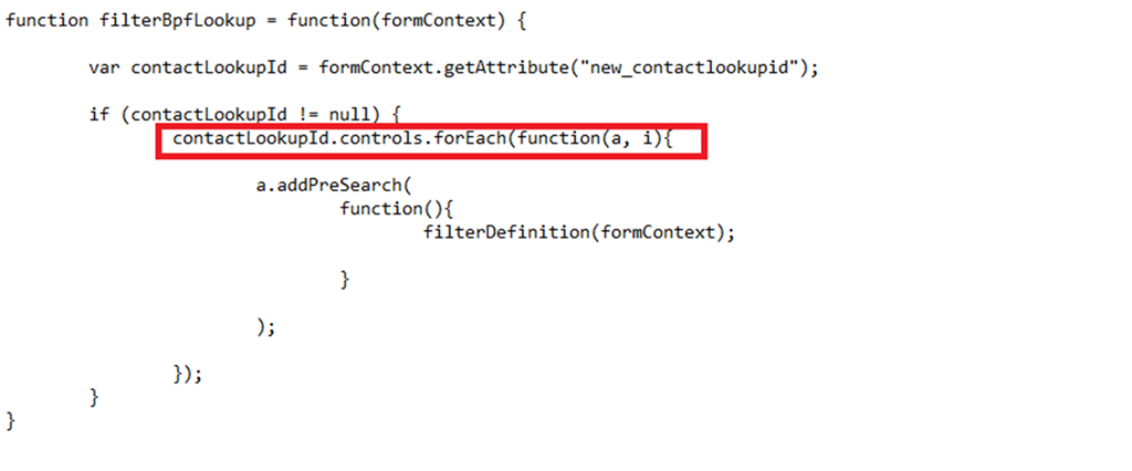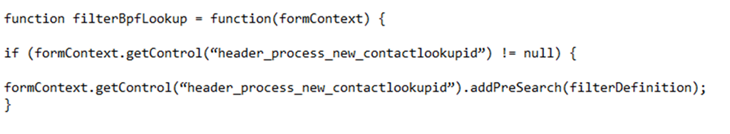 The problem with this is if the business process flow branches, it uses a different control. This means that while you can reference the first control as “header_process_new_contactlookupid”, the contactlookup control in the next BPF branch will have a different name i.e. “header_process_new_contactlookupid_1”.