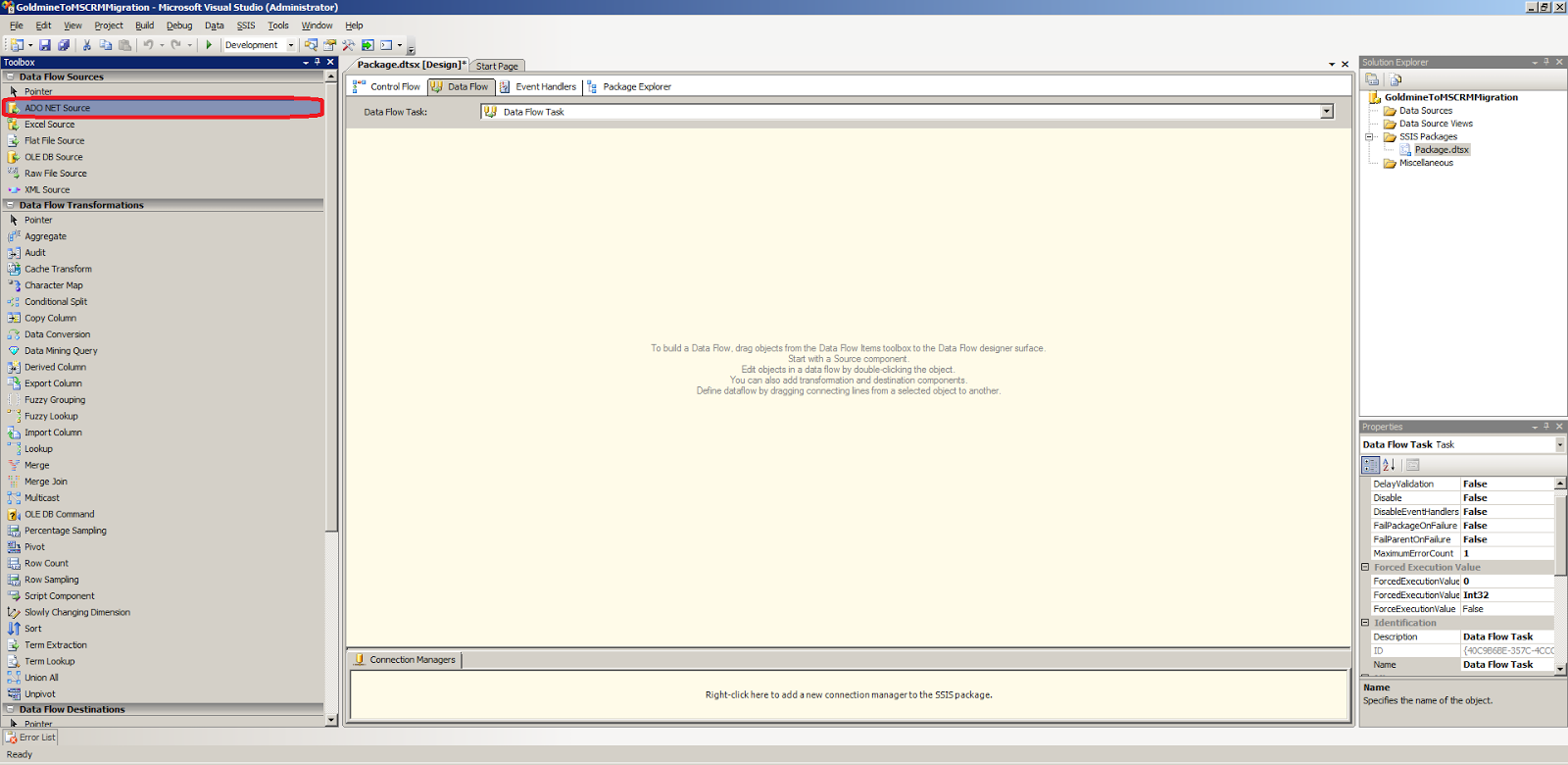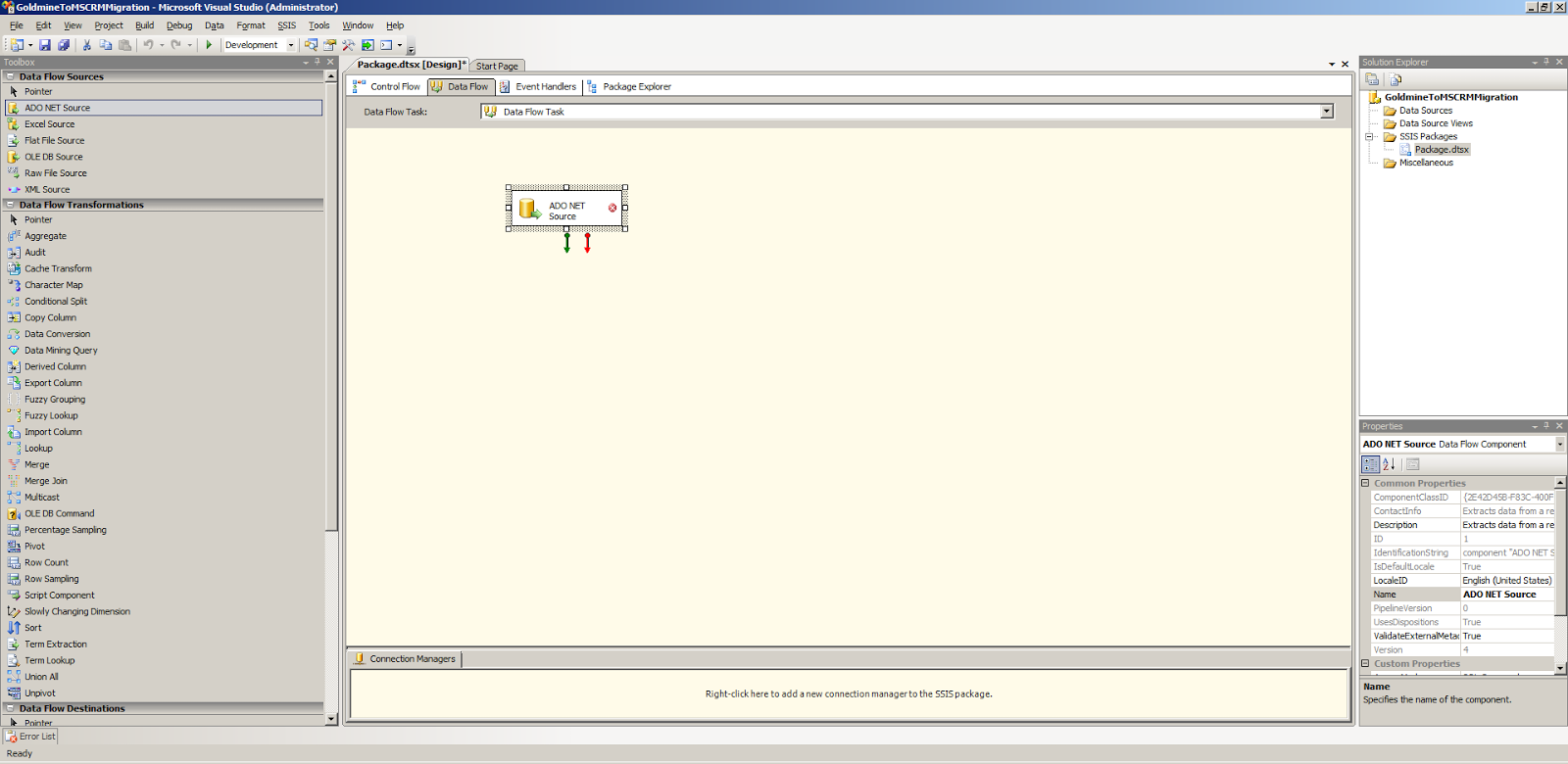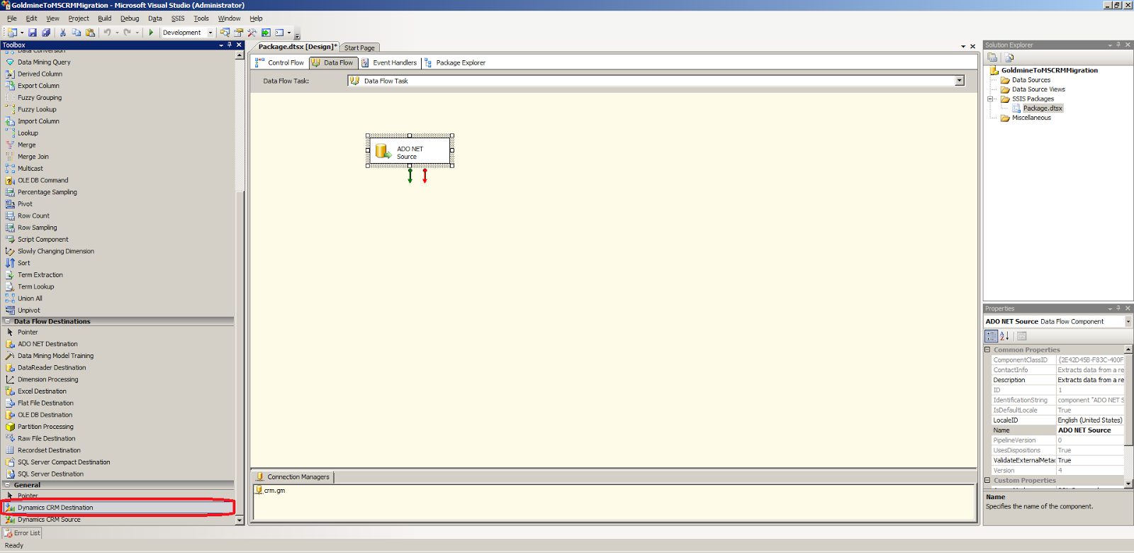 I spent hours discovering what would be the best tool for the migration. I tried Scribe, Starfish and several other products listed in wiki but any of tools satisfied my needs in data extraction from GoldMine for 100%. So I decided to use SSIS Integration Toolkit.