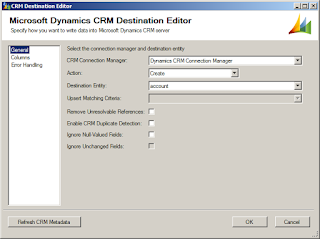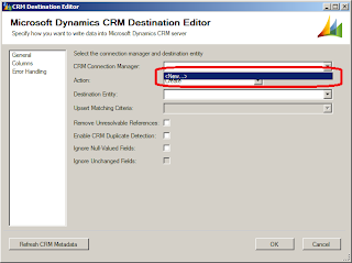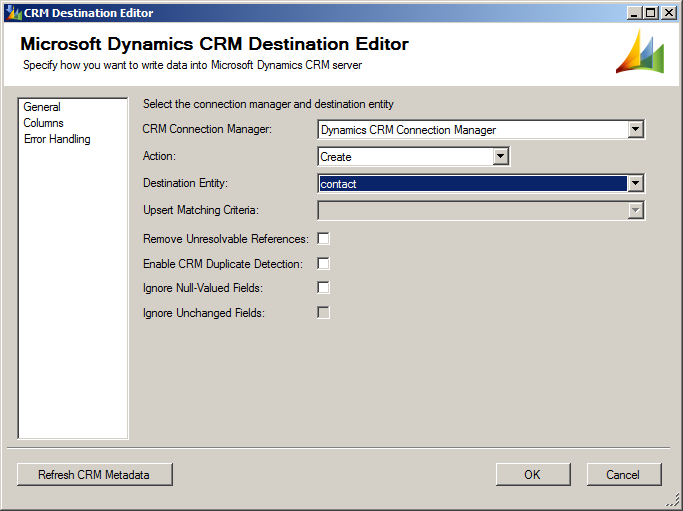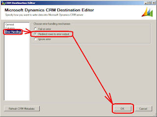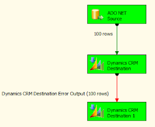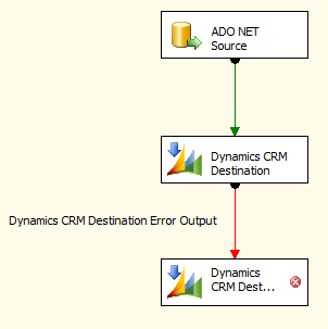 To make import of contacts possible in the same stream open CRM Destination component and choose ‘Error Handling’ tab, choose ‘Redirect rows to error output’:Add second CRM Destination Component to DataFlow and connect it with first: