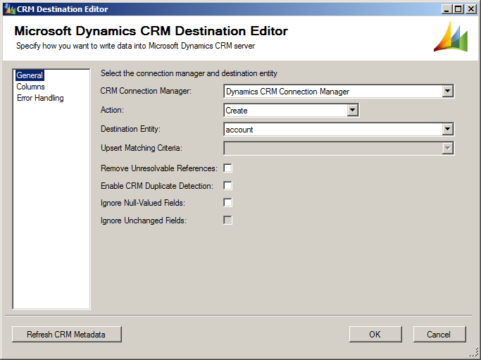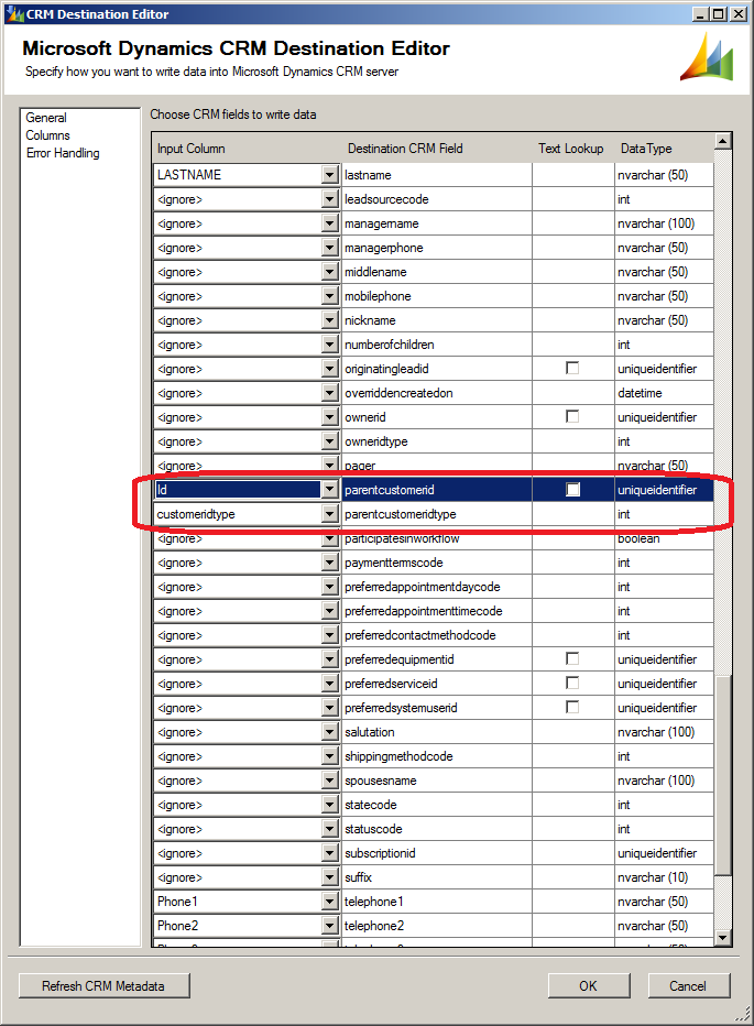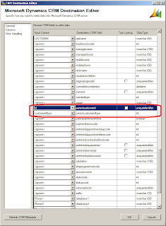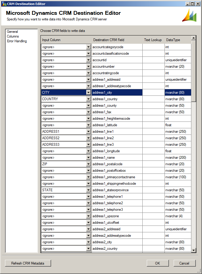 Open CRM Destination component and expand Columns tab, map source and destination fields, click Ok: