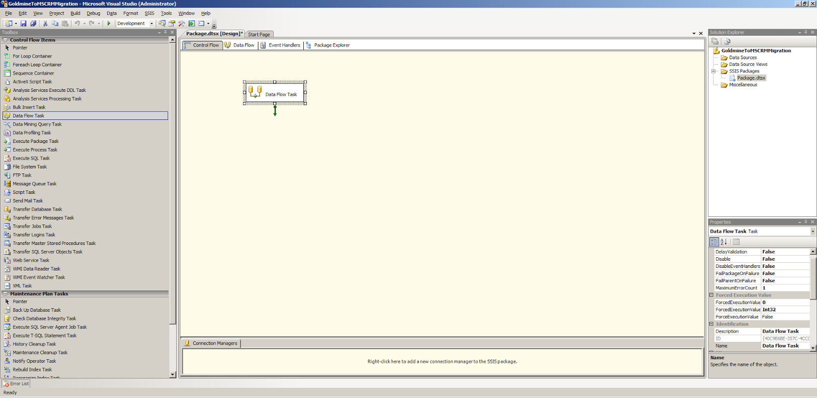 2. Once you finished with query create new SSIS project using BIDS (to make migration to CRM 2011 possible you will have to have SSIS Integration Toolkit already installed on your server):