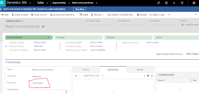Now create new opportunity for the "Fabricam" account then the currency will be automatically set to be a "AUDDollar" only.