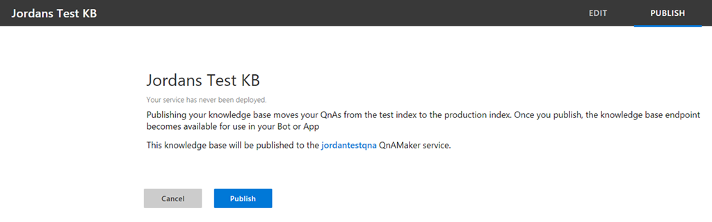 Once you’re satisfied with the QnA source you have created, you can select the Publish button and publish the QnA knowledge base to be used publicly. The success page will provide you with a sample HTTP request, which you can use to connect your newly created service to a bot or an app.