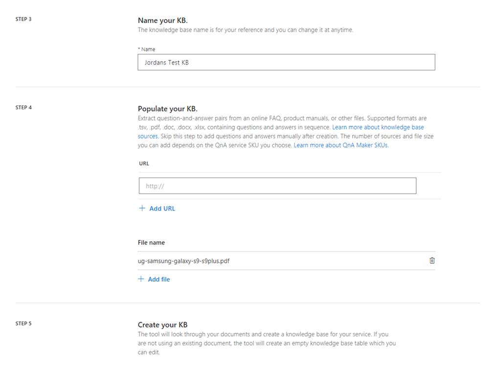 Step 3 will allow you to name your knowledge base, followed by Step 4 which is used to populate it. To populate your knowledge base, you can provide a URL for a data source, a document file such as a word or pdf file or you can leave this part empty and populate the questions and answers manually once it has been created.