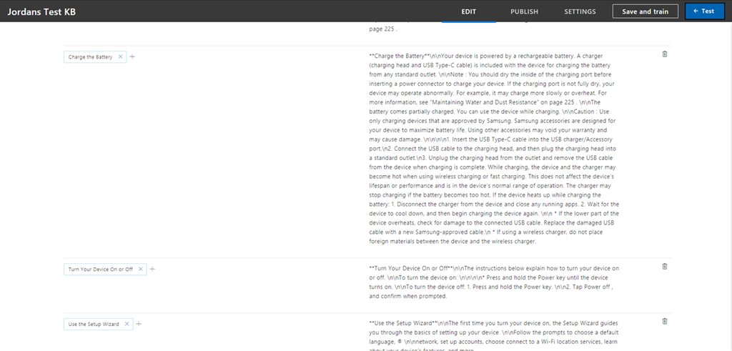 In the example above, I attached a user guide for the Samsung Galaxy S9 as my knowledge base source. After adding the pdf file and selecting ‘Create your KB’ in Step 5, the QnA bot knowledge base began populating. Around two minutes later my knowledge base was ready to be tested. The screenshot below shows a snippet of the 33 pages worth of questions and answers created from the attached pdf.