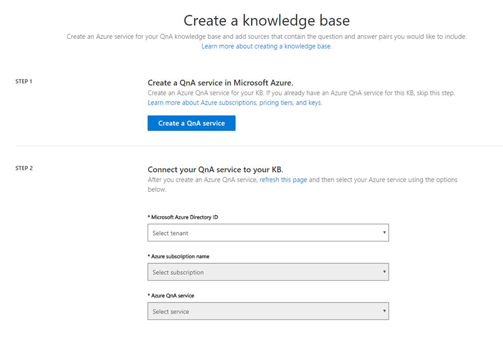 To start you would need to navigate to https://www.qnamaker.ai/, sign in using your Microsoft Account and then select ‘Create a knowledge base’. The first two setup steps shown in the screenshot above require you to create and select a QnA Service. Selecting the ‘Create a QnA service’ button will redirect you to the Azure Portal, guiding you in creating your own service.