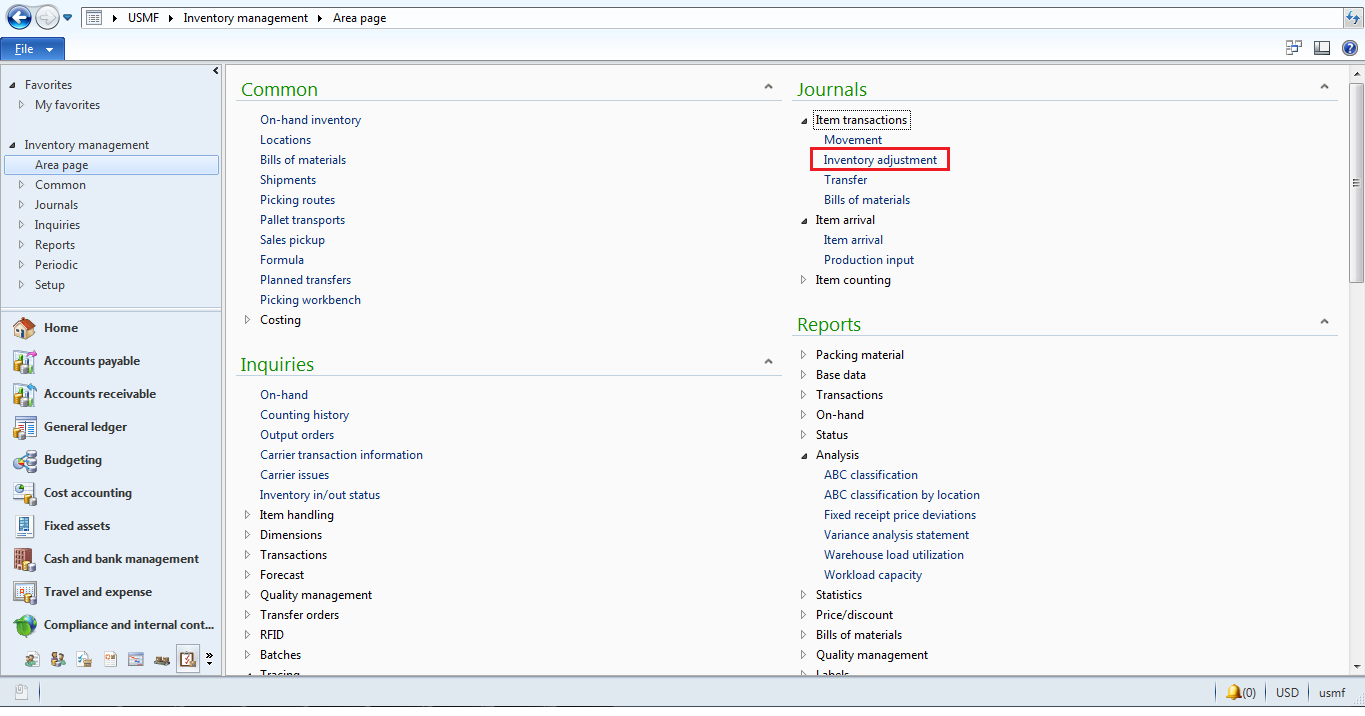 1.Go to inventory management > Journals > Item transactions > Inventory adjustment.