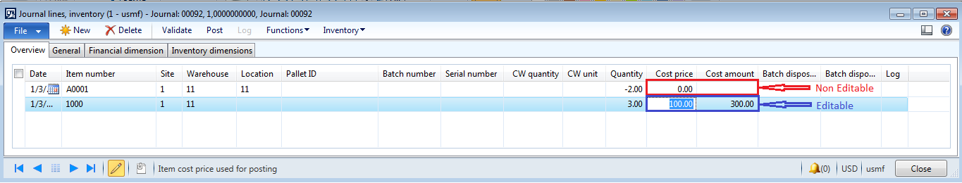 5. Quantity and cost amount: if you are adding the inventory then enter the positive value in the quantity field. If the quantity is positive then you can edit the value displayed in the cost amount/cost price field.