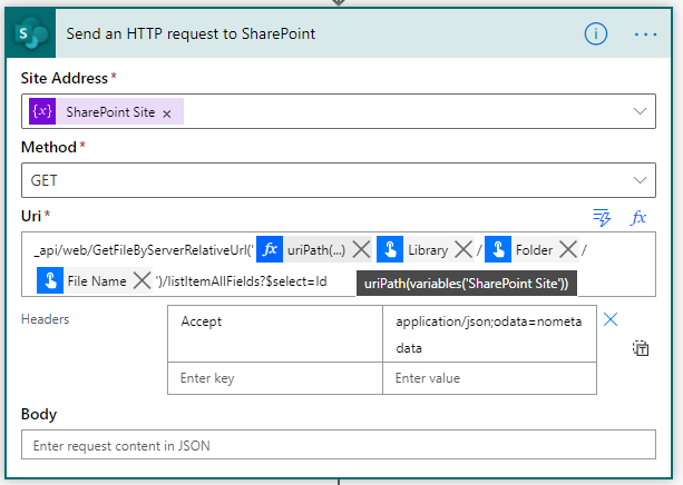 Getting the Unique Identifier would be easy if the output of the trigger or the action in the steps above contains the value of the Unique Identifier. But in my scenario, I only have the file name and the folder path (File Identifier) but I need the Unique Identifier to update the file properties. (this also applies if you want to update or delete the item, grant access or stop sharing)