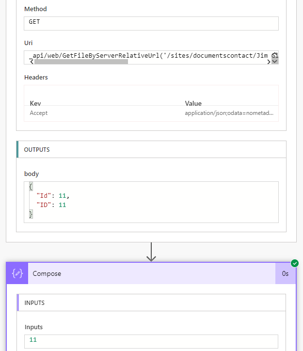 When we run the action above, we will get the Unique Identifier integer of the file using the expression below.