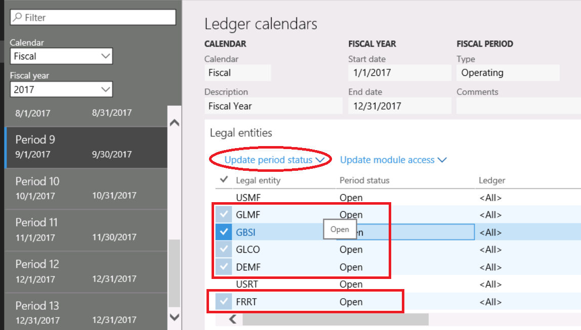 select legal entities and click update period status button
