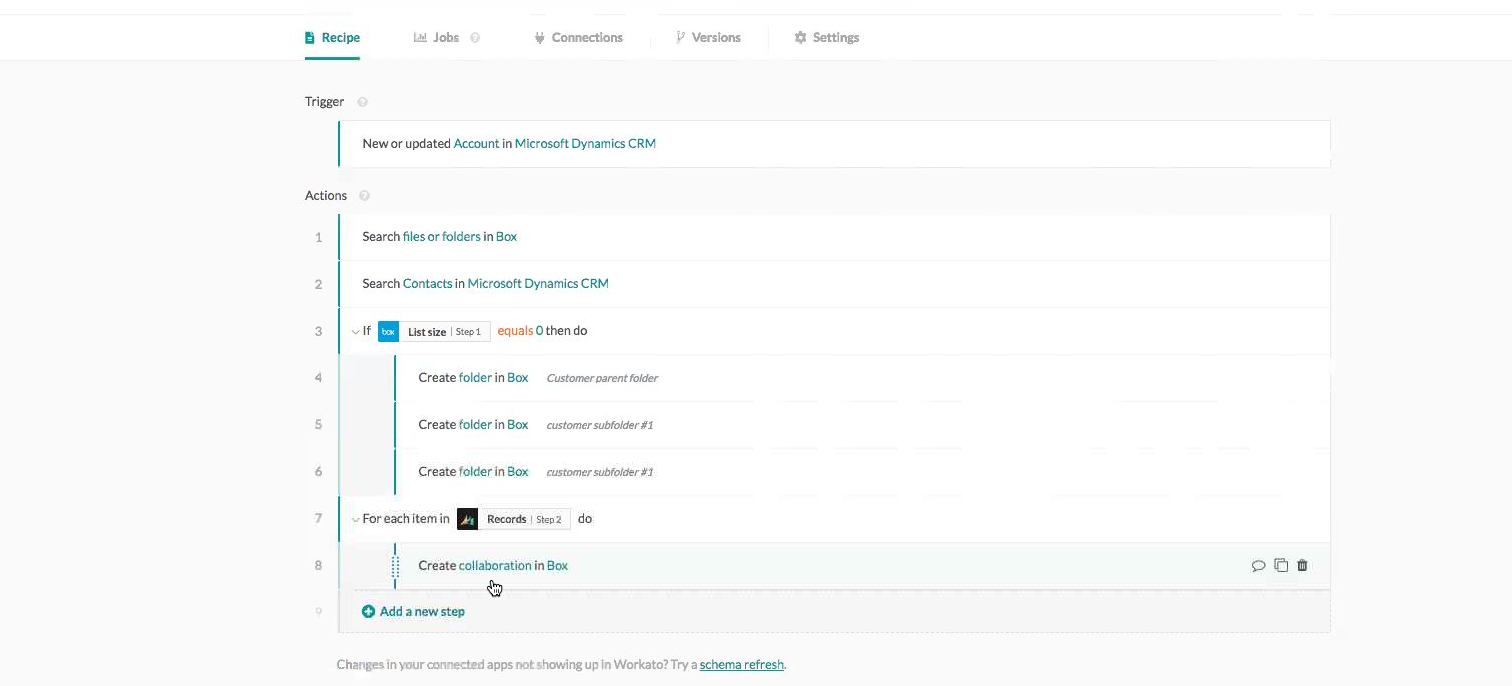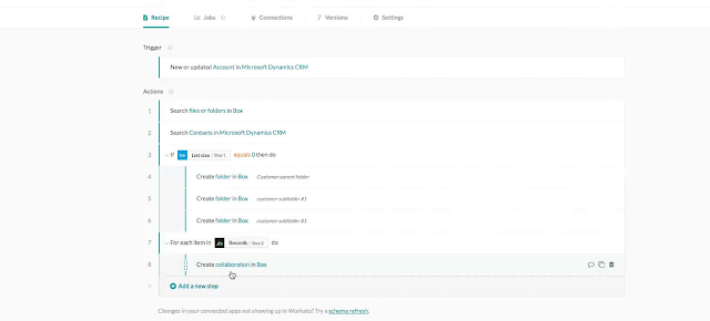 I was able to put these moving parts together, whenaver a new Account is created in Dynamics 365 CRM online - Workato recipe triggered & created a folder in Box & then posted a message in Slack channel like a Bot. Sounds like a Mission, but happily accomplished!