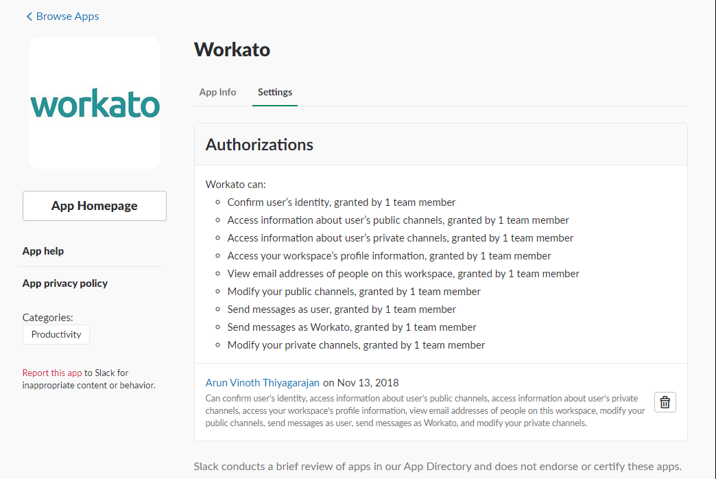 Then, under the Slack apps - install the Workato in the workspace by giving some scope/permissions needed for the orchestration.