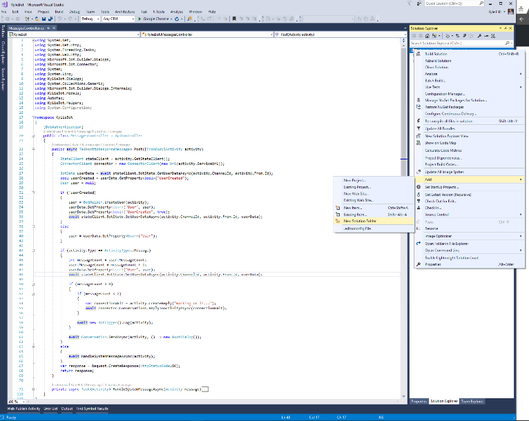 Once this is done, we are going to need to add a new Dialog for our searches. To do this, right click on the Dialogs folder in the KylieBot solution and select ‘Add -> Class’ like this: