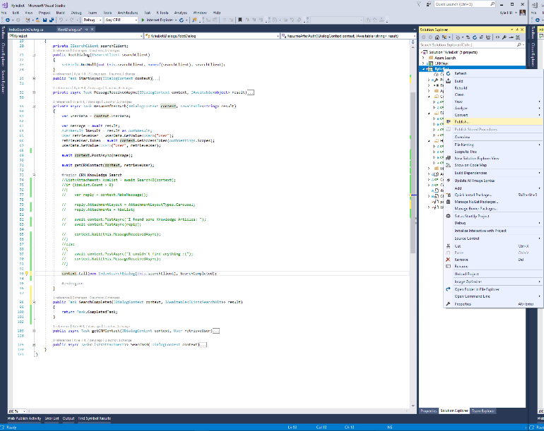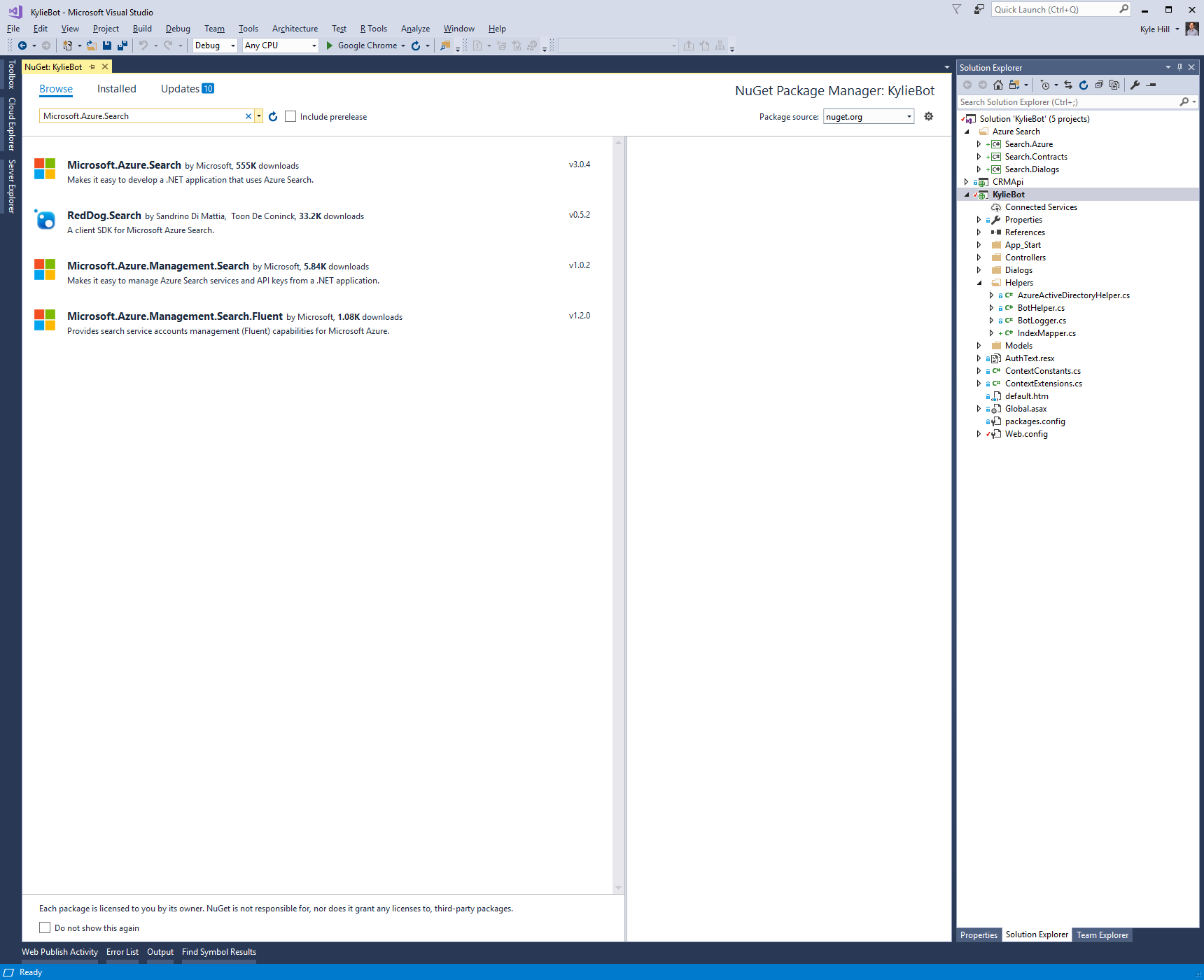 It is now time for us to update our Kylie Bot to look at the Azure Search index, instead of directly at the Dynamics 365 Customer Engagement database. First thing’s first, there is a trove of useful content here from Microsoft. In particular, we are going to use their pre-built wrappers, but more on that later.