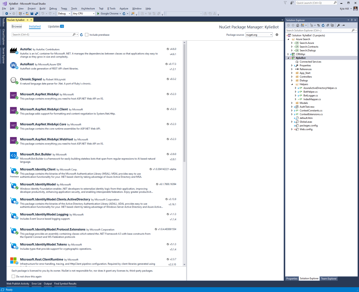 We will also need to add a reference to: Microsoft.Azure.Search. To do this, right click on the KylieBot project and select ‘Manage Nuget Packages…’ and you should see this: