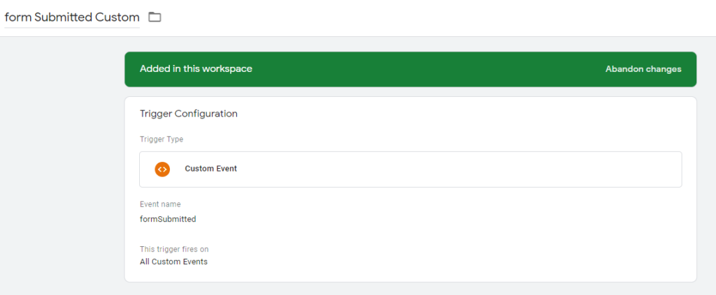 Next, we are going to add another Trigger this time one that will run when formSubmitted is past through as information from a webpage. This should all be clear in a moment. Add a new Trigger with the Trigger Type of Custom Event. Add in the Event name of formSubmitted. Then give the Trigger a name that is logical, such as form Submitted Custom.