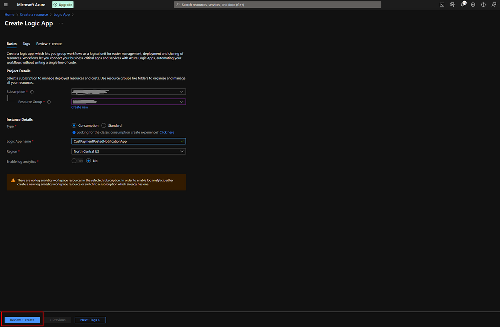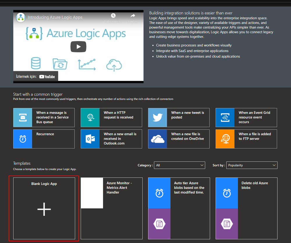 Click Review + create and Create. Then Go To Resource and select Blank Logic App.