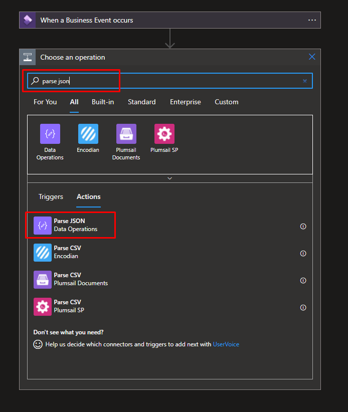 Click + New step, type Parse json and select it in actions.