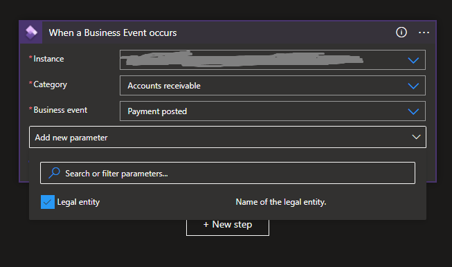 Select your Instance, Category, Business event and click Add new parameter then check Legal entity and select USMF.