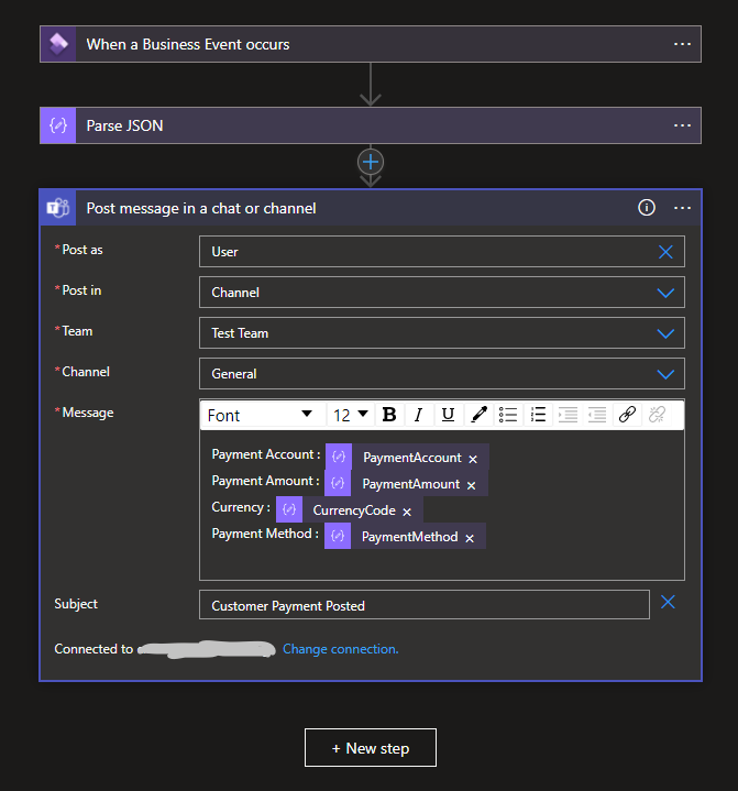 Select Team, Channel and edit Message Body from Dynamic content. Then save it.
