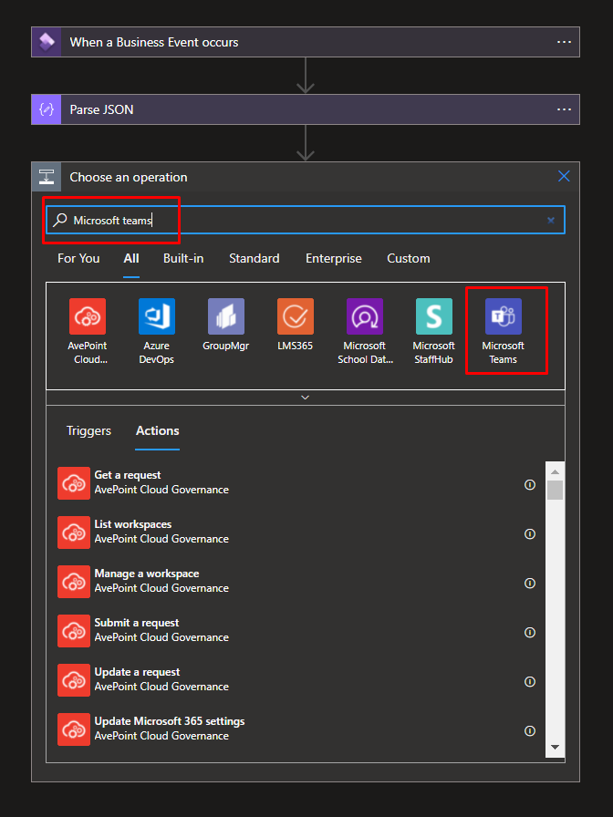 Click + New step, type Microsoft teams.