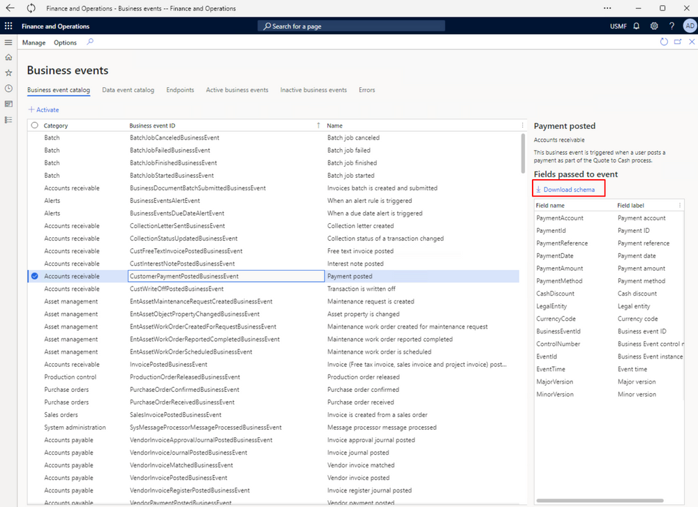 Find the business event and click Download schema.