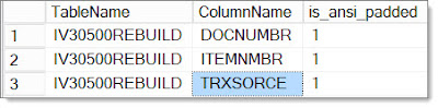The query shows that is_ansi_padded = 0 for IV30500. But if I run the same query on the IV30500REBUILD table, which was created by SQL Server when I exported data out of IV30500, I get different results.