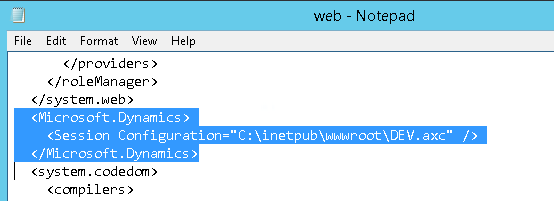 - Assuming the installation at step 3 went through successfully, your next step is to make sure the new site always connects to the right environment. Copy a working AX Configuration file (AXC-file) locally to the server. Make sure it has an updated and correct WCF-configuration in it. I tend to put the file under c:\inetpub\wwwroot\. Give it a good name (like DEV.axc). I know the official documentation says the file can be on a UNC-share, but I never got that to work, so a local file seems to work ok. Finally, you need to put a reference to this file inside the web.config for this particular Web Application. The file is normally located under C:\inetpub\wwwroot\wss\VirtualDirectories\81 (given this application runs on port 81). Open the file in some notepad or text editor and put in a new XML section: